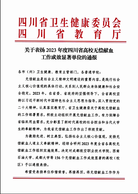 近日,四川省卫生健康委员会和四川省教育厅联合发文《关于表扬2023年度四川省高校无偿献血工作成效显著单位的通报》,伟德官网荣获“2023年度四川省高校无偿献血工作成效显著单位”称号。2023年,党委学生工作部坚持以习近平新时代中国特色社会主义思想为指导,高度重视无偿献血等志愿公益活动。认真落实教育厅、省卫生健康委及各级红十字会关于无偿献血的工作部署要求,将无偿献血作为引领大学生践行社会主义核心价值观的重要载体。多形式、...