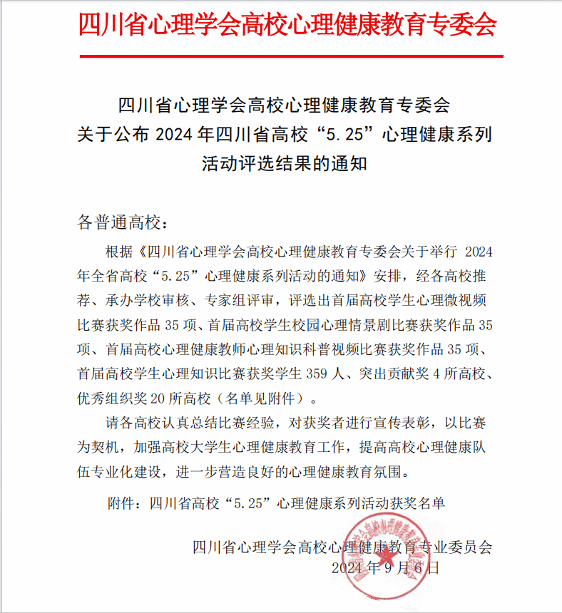 近日,在2024年四川省高校“5·25”心理健康系列活动中,伟德官网心理微视频作品《推开窗,迎接光》荣获四川省三等奖,23连锁经营与管理班的吴天浩同学、23大数据与会计10班的张恒同学,在心理知识比赛中获奖。2024年四川省高校“5·25”心理健康系列活动由四川省教育厅指导,四川省心理学会高校心理健康教育专业委员会主办。近年来,学院党委高度重视学生心理健康工作,坚持“生命至上、健康第一”的理念,探索构建了教育教学、实践活动、...
