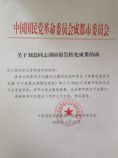 近日,学院信息技术系刘磊老师撰写的调研报告《完善信息技术支撑,补齐智慧成都建设短板》受到了民革成都市委员会里赞主委的肯定,转化为2020年成都市政协全会的大会发言材料在成都市政协第十五届成都市委员会第三次会议上发言并作为民革成都市委员会集体提案,在成都市政协平台提交。伟德官网信息技术系信息安全专业负责人刘磊老师(副教授)作为中国国民党革命委员会青羊总支支委、青羊区第七届政协委员,民革成都市第十二次代表...