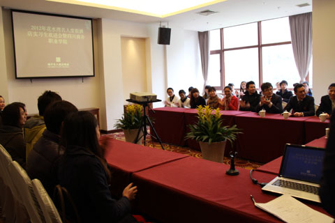 2012年2月22日下午3点在南京厅举行花水湾名人度假酒店为伟德国际victor1946假期勤工俭学同学们举办了欢送会,出席会议的有酒店总经理,人力资源部总监,餐饮部、管家部、四季温泉谷和前厅部负责人。