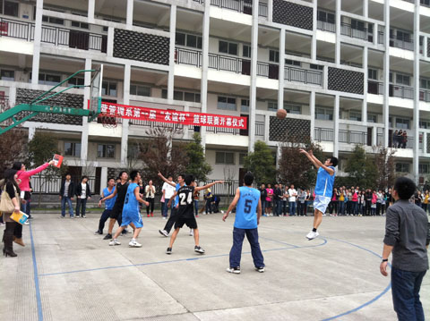 3月26日中午经营管理系学生会体育部承办的第一届“友谊杯”篮球联赛开幕式在六教楼下篮球场举行,经营管理系主任梁栋、党总支书记陈小虞、副主任王琦和辅导员老师参加了开幕式。