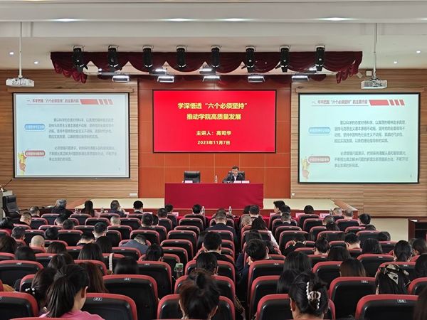 高司华同志强调,全院党员干部必须深刻领会习近平新时代中国特色社会主义思想,深刻领会党的二十大精神,深刻领会“六个必须坚持”的精髓要义、价值追求和立场观点方法,立足学院发展实际,主动有效应对学院发展中面临的困难和出现的各种新问题、新挑战,不断优化学院发展的思路,不断推进作风建设,不断提高学院办学水平,全力推动学院在重大发展机遇面前迎头赶上,在标志性成果上实现突破,从“深化校企合作、建设高水平专业群、培养一流教师队伍和干部队伍、深入开展三教改革、加强大学生思想政治教育、加大科研与社会服务能力建设、提升国际合作与交流水平、强化就业创新创业工作、加强依法治校”等九个方面再下功夫,争创实效。