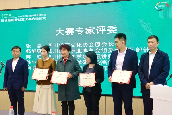 西南财经大学经济与管理研究院党委书记黄文和四川快邦商学院高级讲师陈胜分别代表参赛院校和评委团发言。高司华和张强为各位评委颁发聘书。郑鹏斌宣布大赛正式启动,并预祝“第十二届四川国际茶业博览会短视频创新创意大赛”取得圆满成功!