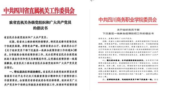 坚守使命,高站位谋划防疫战。面对成都市严峻复杂的疫情防控形势,学院立即响应,学院党委第一时间作出部署,发布《关于组织党员干部下沉基层一线参加疫情防控工作的倡议书》,号召党员干部切实提高政治站位,以对全体师生员工和人民群众生命安全和身体健康高度负责的责任感和紧迫感,行动起来,积极战疫,切实抓好疫情防控各项工作。