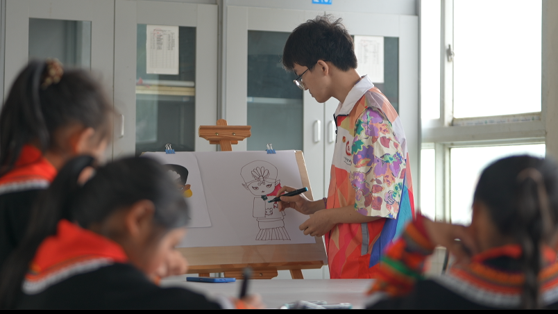 金阳县热柯觉乡中心校是我们此次乡村教育公益行动的帮扶点之一。6月28日,在小朋友们的热烈欢迎下,我们走进中心校和小朋友们进行亲密互动。对于此次公益行动,伟德国际victor1946的师生们做了充足的准备,除了带来了图书、教具、羽毛球拍、乒乓球拍、篮球等文体用品之外,心理健康教师姚又丹和中心校教师共同交流小学生心理健康问题,大学生志愿者们各自发挥所长,用一首儿歌、一首经典诵读、一次游戏、一幅跨越千里共同完成的画、一课棕编、一台军体拳的“六个一活动”和小朋友们进行互动教学。