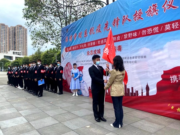 仪式上,系党总支书记陈根元强调了目前全国疫情形势的严峻性,也阐述了旅游管理系抗疫先锋队成立的必要性和紧迫性,希望以学生党员为骨干的先锋队,能够带动全系甚至是全院的师生更加重视疫情防控,更要把防控措施走深走实,入细入微。仪式第二项是系主任张莉将“抗疫先锋队”队旗交到队长何忠明手里,何忠明带领28名队员进行了庄严的宣誓。