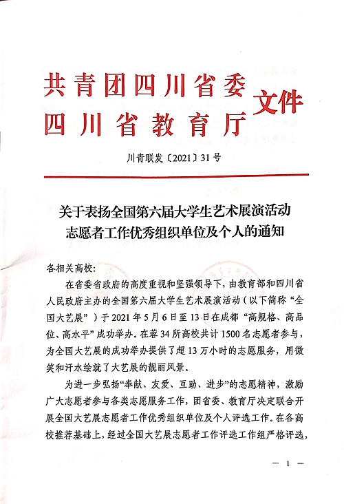 近日,为激励先进、鼓舞干劲,由四川省政府、团省委、教育厅联合发文,对在2021年全国第六届大学生艺术展演活动志愿者工作中优秀的组织单位及个人进行表彰:伟德官网被评为全国第六届大学生艺术展演活动志愿者工作先进集体;冯端、张卡被评为志愿者工作先进个人;赵捷、郝灿、叶茂林被评为志愿者工作优秀指导老师;林英浩、张丛英、陈明旭被评为优秀志愿者。
