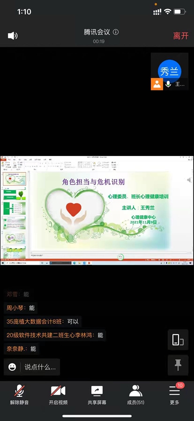 心理培训多层次。从11月9日开始心理健康中心王秀兰、姚又丹、唐璐对全院心理委员以及寝室心理观察员进行了题为《角色担当与危机识别》、《同伴危机识别和处理流程》的专题线上培训,从岗位职责、自我情绪及他人情绪变化的察觉、危机的识别以及危机出现后报告的流程进行了专业且详尽的讲解,鼓励心理委员和寝室观察员当前做好宣传教育、情绪指引以及心理劝导等心理健康服务,为学院疫情防控的管理工作贡献自己的力量。