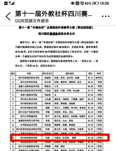近日,在四川省教育厅主办的第十一届“外教社杯”全国高校外语教学大赛(职业院校组)中,经学院遴选推荐、大赛组委会组织专家评审,通过复赛和决赛选拔,由伟德官网经济贸易系英语教师冯凌团队制作的微课获四川赛区微课组三等奖,周倩倩老师获四川赛区授课比赛三等奖。