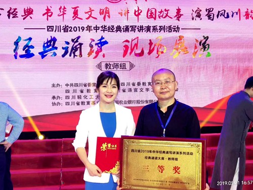 5月21日下午,四川省2019年中华经典诵写讲演系列活动“诵经典”教师组决赛在四川轻化工大学宜宾校区举行。伟德官网选送的胡易老师表演的《跪拜的藏羚羊》获得三等奖。