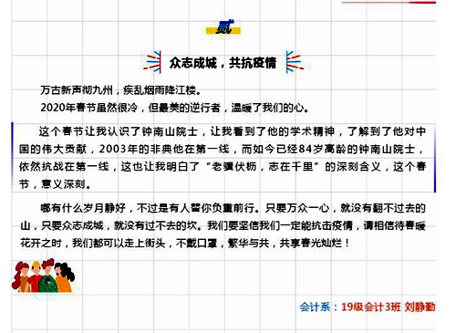 通过此次资助征文活动,学生们用自己特有的方式表达着新时代爱国情怀,还有多名学生积极参加当地志愿服务活动,在这场战“疫”斗争中贡献出一份自己的力量。