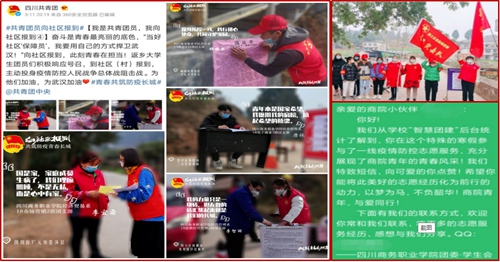 共青团在公众号开设《商院青年·一线战疫记》板块,广泛收集、精心制作、努力传播伟德官网青年志愿者的防疫工作故事,宣传学子们投身家乡抗疫志愿服务一线的工作风采,宣传商院学子“用点点平凡光,助力抗疫阻击战”的青春追求。其中,整理制作的4份伟德官网防疫青年志愿者宣传海报,被团省委官方微博“四川共青团”采用报道。