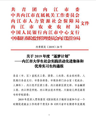 学院2017级会计专业沈丹同学,在内江市参与2019年“逐梦计划”活动中表现突出,受到共青团内江市委、中共内江市直属机关工作委员会、内江市人力资源社会保障局等部门联合表彰。