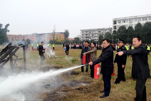 随后由消防队相关人员讲解灭火器的原理、基本操作方法、注意事项及高压水枪的使用方法。在认真观看消防官兵示范后,参加此次演练的院领导及同学们亲自体验了现场灭火的过程,面对熊熊燃烧的火堆,表现得积极勇敢,按照使用灭火器的方法和步骤,将大火迅速扑灭,做到了冷静处理,得到了消防人员的认可。