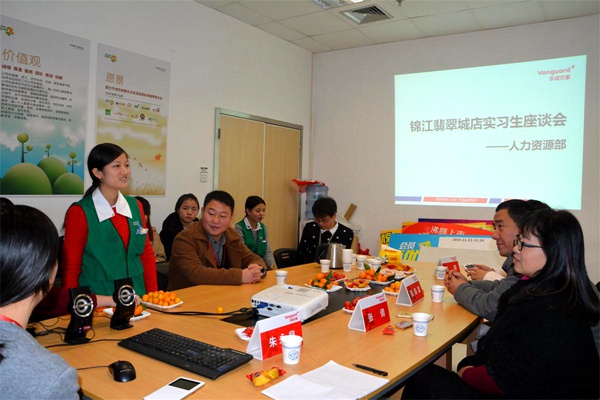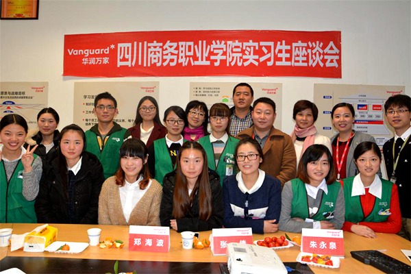 伟德官网2013级人力资源、连锁经营管理专业共13名学生在华润万家实习5个月以来。学院为了更好的沟通、掌握实习学生生活、工作、思想等情况,12月10日学院经营管理系张倩主任、总支书记郑海波一行4人到华润万家锦江翡翠城店,与公司胡承发经理、陈治宇经理、颜峰经理以及实习学生,共同举办了本次实习生座谈会。
