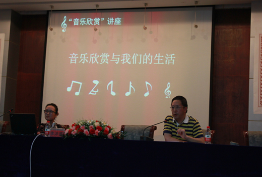 讲座中,李老师向在座师生讲解了音乐的特点、音乐与其他艺术的区别、音乐的定义、音乐的功能、中外经典音乐欣赏及用历史故事演绎了我国传统乐器的神奇和古典音乐迷人魅力;对中国传统音乐的历史地位和历史典故(如:“凤求凰”、“空城计”等)及传统乐器作了生动的介绍,最后还着重讲述了我国的传统乐器之王—古琴。讲座中,李老师通过在音乐中运用联觉来感受音乐的魅力和传统音乐“虚实相生”的韵味,让朋家深切感受到了古琴乐器弹奏的《流水》等乐曲的魅力所在,李老师的精彩演讲多次赢得同学们经久不息的掌声。