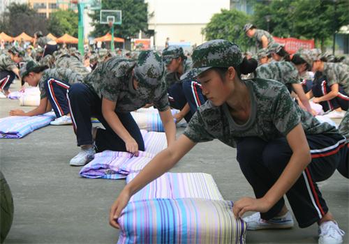 1500余名军训新生在规定的时间内把被子叠的整整齐齐、有棱有角、方方正正。最后评选出10名被子叠得非常优秀的同学,并将这些优秀学员叠的被子向全团展示。