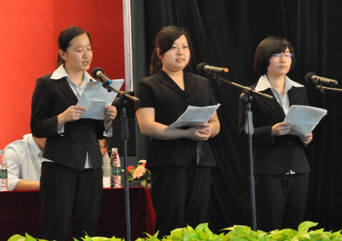 来自2012届的刘珊、李真、邹的玲同学,通过创作的现代诗,代表全体毕业生们动情地表达了心声。感谢母校用包容的精神、坚毅的品格铺就成长之路。感谢敬爱的老师、深爱的父母、亲爱的同学,予以的教导、支持和鼓励。三位同学的朗诵,字字含情、句句传意。最后,她们用深深的鞠躬,表达了全体毕业生心中如重千钧的感谢与感恩。