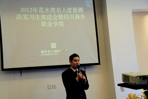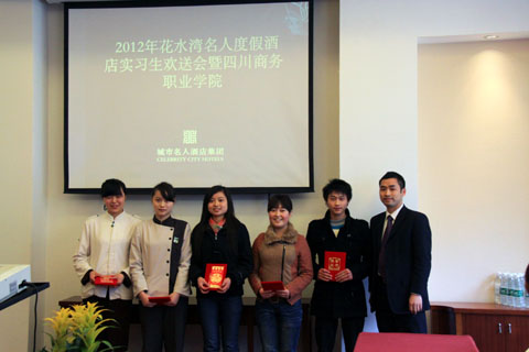 2012年2月22日下午3点在南京厅举行花水湾名人度假酒店为伟德国际victor1946假期勤工俭学同学们举办了欢送会,出席会议的有酒店总经理,人力资源部总监,餐饮部、管家部、四季温泉谷和前厅部负责人。
