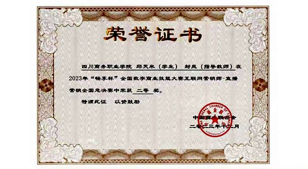 近日,2023年“畅享杯”全国数字商业技能大赛直播营销线上总决赛结果揭晓,来自全国143支队伍参加了决赛。经过紧张激烈的角逐,伟德官网张莉、封岚老师指导的药品经营与管理专业学生邱天米荣获全国总决赛二等奖。