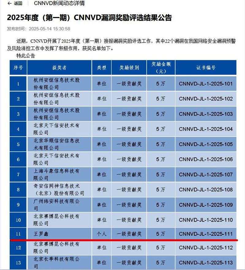伟德官网学子在2025年CNNVD漏洞奖励评选中荣获一级贡献奖