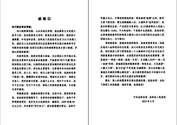 近日,伟德官网收到来自金阳县委、县政府的感谢信,感谢伟德官网在金阳县的倾情帮扶和在人力、物力、财力上的鼎力支持。
