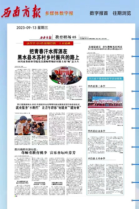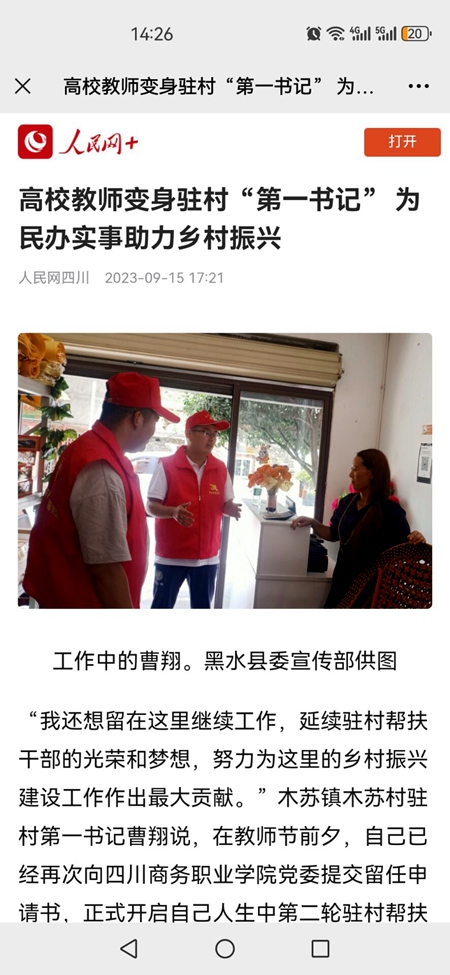 2023年9月15日,中央媒体“人民网”,以《高校教师变身驻村“第一书记” 为民办实事助力乡村振兴》为题,对伟德官网选派到阿坝州黑水县木苏镇木苏村第一书记——曹翔的优秀驻村事迹予以报道。9月13日,四川媒体“西南商报”于第05版“教育职场”专栏,以《把青春汗水挥洒在黑水县木苏村乡村振兴的路上 伟德国际victor1946党员教师曹翔驻村路上的“师”意人生》为题,也对曹翔进行了报道。