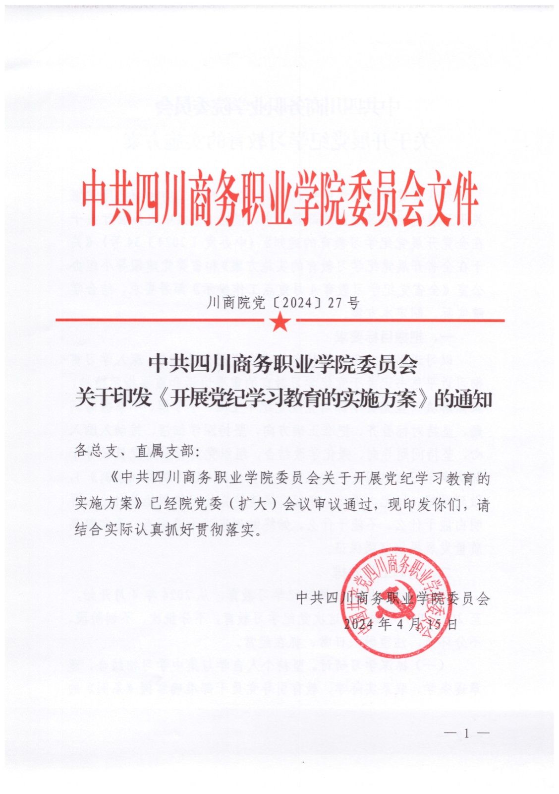 川商院党[2024]27号-关于印发《开展党纪学习教育的实施方案》的通知 (1).doc