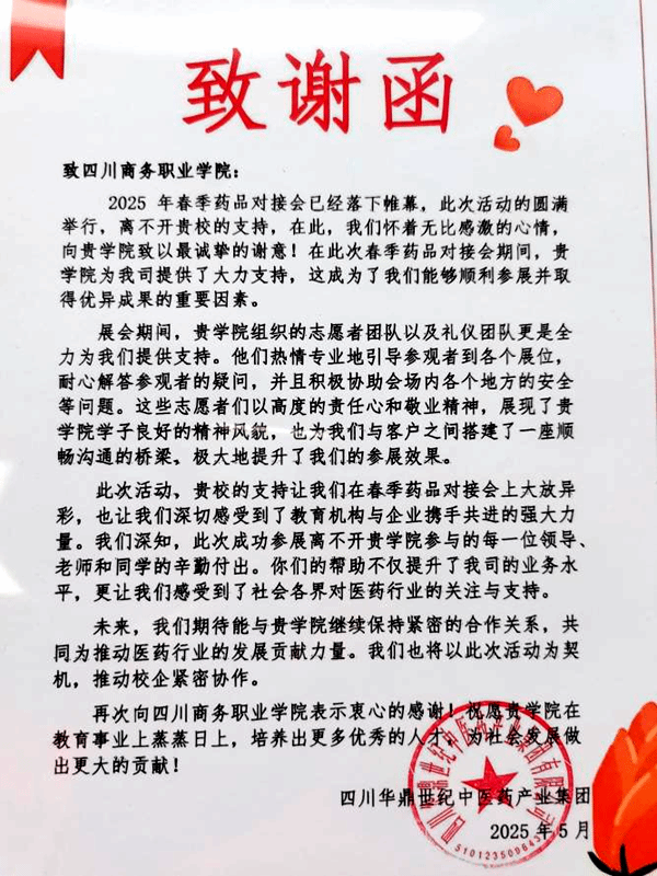 华鼎世纪集团副总裁简道兵在现场向学院颁发致谢函,对学院为本次药交会的成功举办所作的努力表示感谢,对伟德官网志愿者在药品交易会上的出色表现给予了高度肯定。企业方认为在为期两天的药交会上,志愿者们以饱满的热情、专业的素养投身服务工作,从展会现场的秩序维护、客商的接待引导,到联盟会前会议、产品推介会议上的会务服务,志愿者们在每一个细节都做到尽善尽美,极大提升了展会的服务品质与效率,助力了本届药交会的圆满举办。