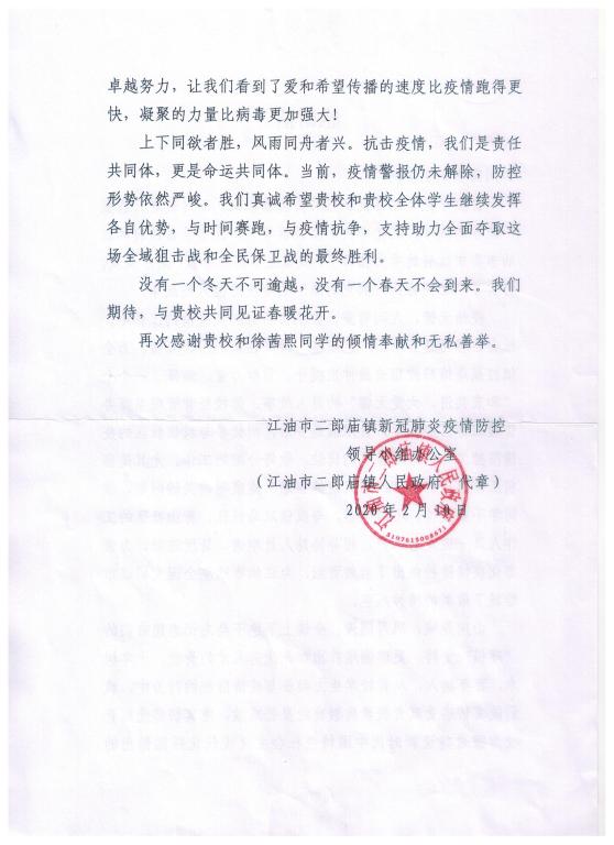 经营管理系20级商务管理班徐茜熙同学在去年新冠肺炎爆发期间,积极参加到江油市二郎庙镇社区的疫情防控工作中,不辞辛苦,为当地常态化疫情防疫工作作出了贡献。江油市二郎庙镇防疫办为表达感谢之情,特向伟德官网发来感...
