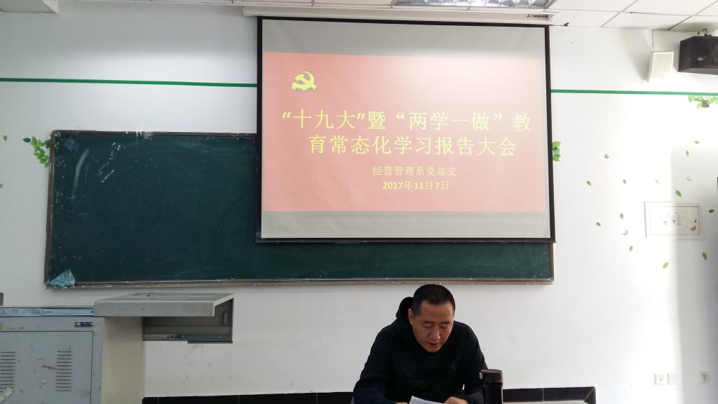 2017年11月7日下午两点,经营管理系党总支全体党员分两次于第一教学楼202室召开学习“十九大”暨“两学一做”教育常态化学习党员大会。会议由党总支书记郑海波主持。 一、认真学习“十九大”报告 郑书记要求广大党员...