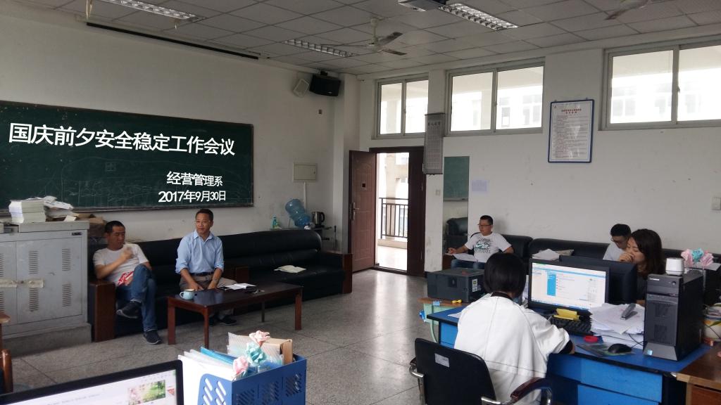2017年9月30日上午九点整,经营管理系于第一教学楼306室召开国庆前夕安全稳定工作会议。出席本次会议的有经管系系主任梁栋、系党总支书记郑海波、系党政办主任朱永泉、全体辅导员和行政人员。本次会议主要内容是针对...
