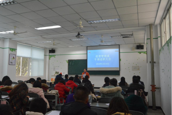 2019年1月14日下午1时30分,经营管理系于第一教学楼202室召开经营管理系干部述职述廉暨教职工大会。出席本次会议的有学院院长高司华同志、学院党政办主任池秋平同志、经营管理系主任梁栋同志、经营管理系党总支书记郑...