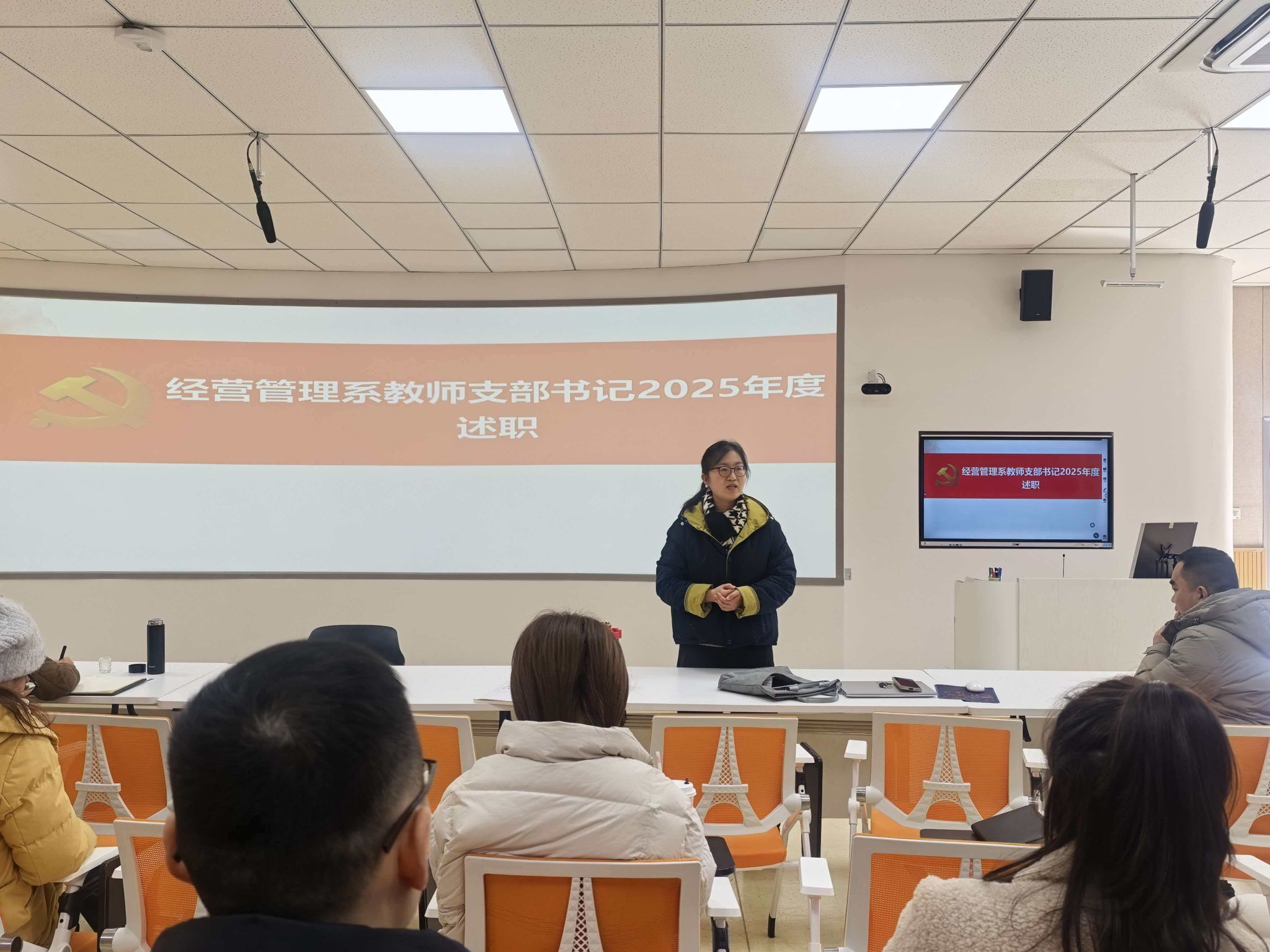 会议最后,教师支部书记程钰与学生支部书记何俊烨分别作 2025 年度述职报告,全面总结过去一年支部党建工作成效、存在问题及下一步工作计划,为后续党建工作提质增效明确方向。此次大会的召开,进一步统一了思想、凝聚了合力,为经营管理系高质量发展注入新的动力。