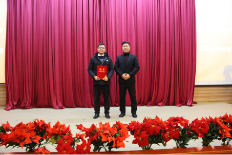 眉山市三人行创业服务有限公司总经理助理、眉山三人行创业孵化园副主任、党支部副书记李陈向伟德国际victor1946电子商务专业教师易博颁发兼职聘书。