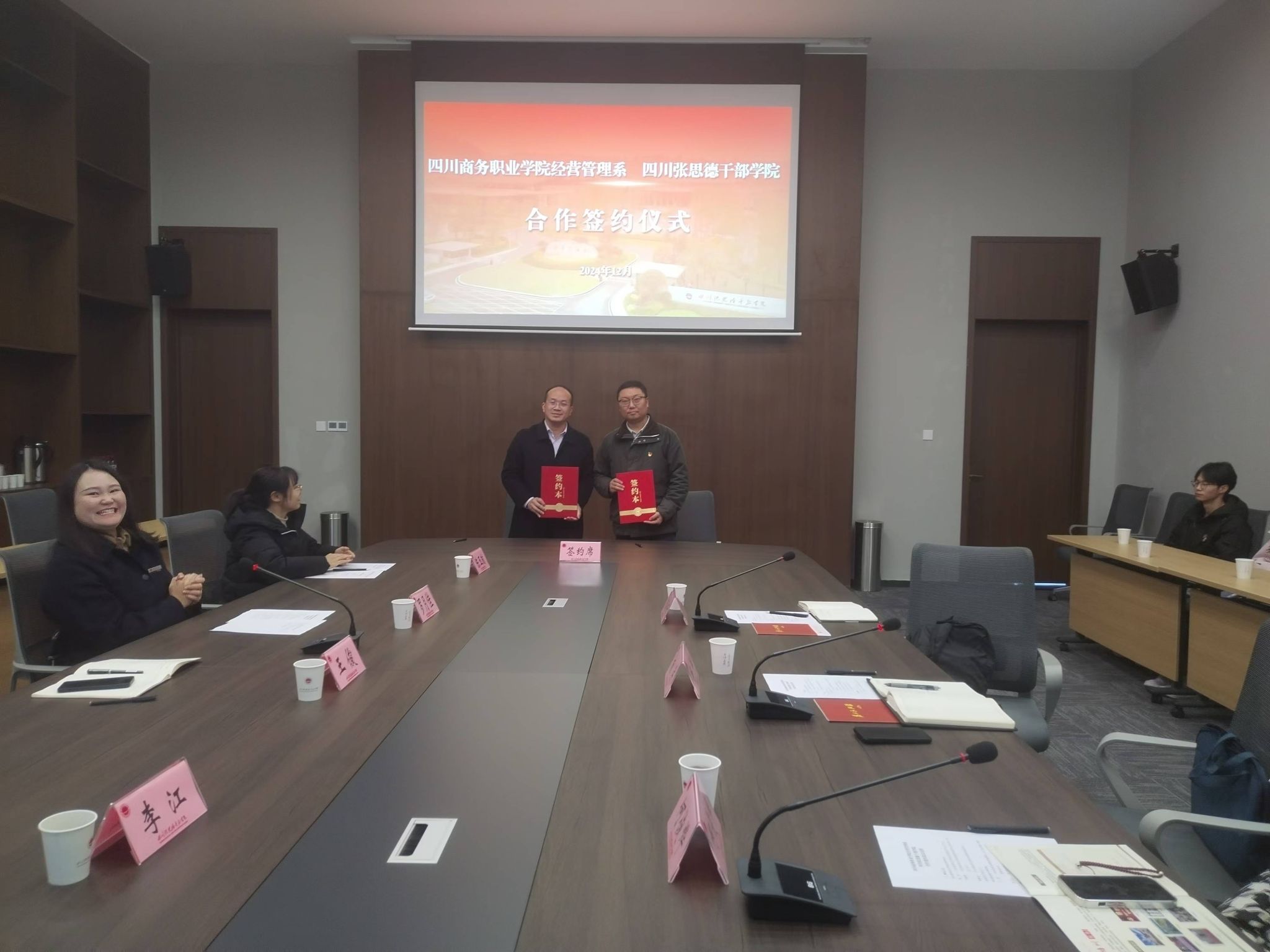 124日,四川张思干部培训学院与经营管理系合作协议签约仪式在四川张思德干部培训学院307会议室举行仪式。中共仪陇县委组织部副部长、四川张思德干部培训学院院务委员王俊、经营管理系党总支书记杨洪出席仪式,并代表双方签约,双方师生代表20余人参加了签约仪式。