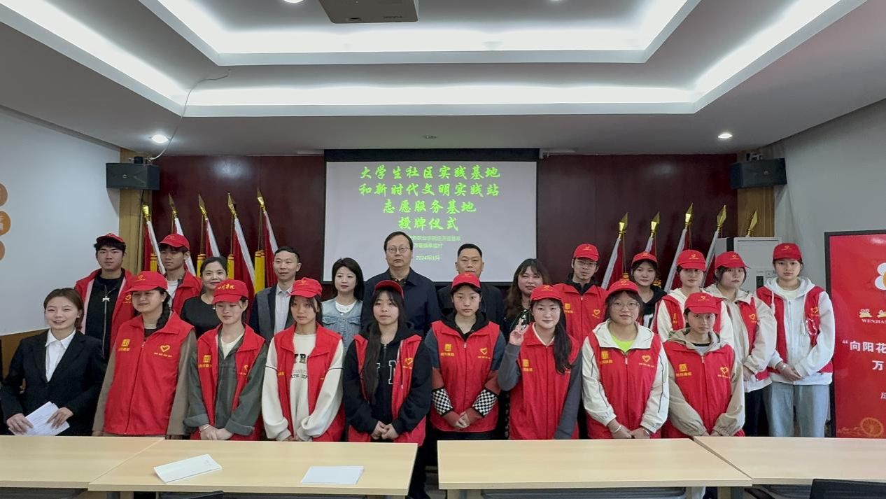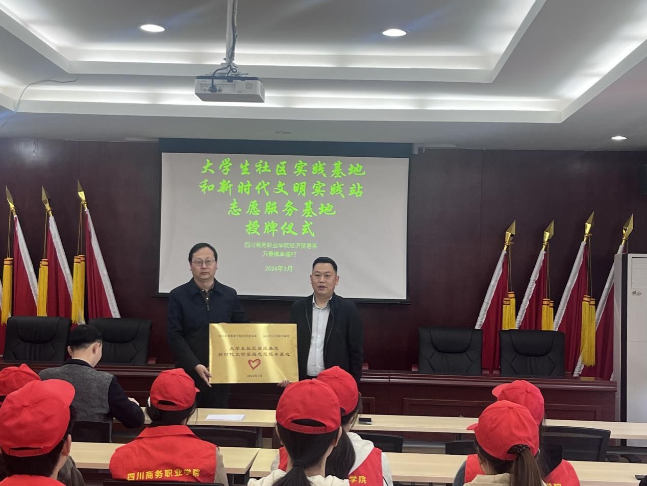 2024年3月29日上午,伟德国际victor1946经济贸易系与万春镇幸福村“大学生社区实践基地”和“新时代文明实践志愿服务基地”授牌仪式在幸福村村委会举行。幸福村党委书记唐小兵,“村两委”委员文龙,刘娇,学院党政办主任、经济贸易系党总支书记管齐峰,经济贸易系党政办主任马如龙,团总支书记庞莹莹以及学生代表参加了仪式。