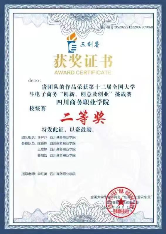 2022年5月28日第十二届全国大学生电子商务“创新,创意及创业”决赛在四川农业大学都江堰校区举行。经过激烈角逐,我系由李红英等老师指导的两支队伍,奥斯卡五小金人队王嘉玲、仲秋燕、邓雨荷、王宇翔、黄妍;demo队许尹齐、陈路林、王意婷、姜丽曾分别荣获校级赛二等奖。本次比赛采取了学生线上答辩,评委、纪检与仲裁线上与线下相结合的方式进行,四川赛区选拔赛分为初赛、复赛和决赛三个阶段。大赛于2021年12月在四川农业大学都江堰校区启动,共吸引了全省62所高校、12107支团队参赛,参赛数量为历年之最、在全国排名第一。