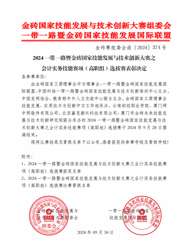 一带一路暨金砖国家技能发展与技术创新大赛会计实务技能赛项由金砖国家工商理事会中方理事会、一带一路暨金砖国家技能发展国际联盟、金砖国家技能发展与技术创新大赛组委会主办,该赛事自创办以来,已成功举办多届,赛事聚焦于产业数字化转型背景下的财会人才需求,通过推动职普融通、产教融合、科创融汇,已成为国内颇具影响力的会计领域赛事。