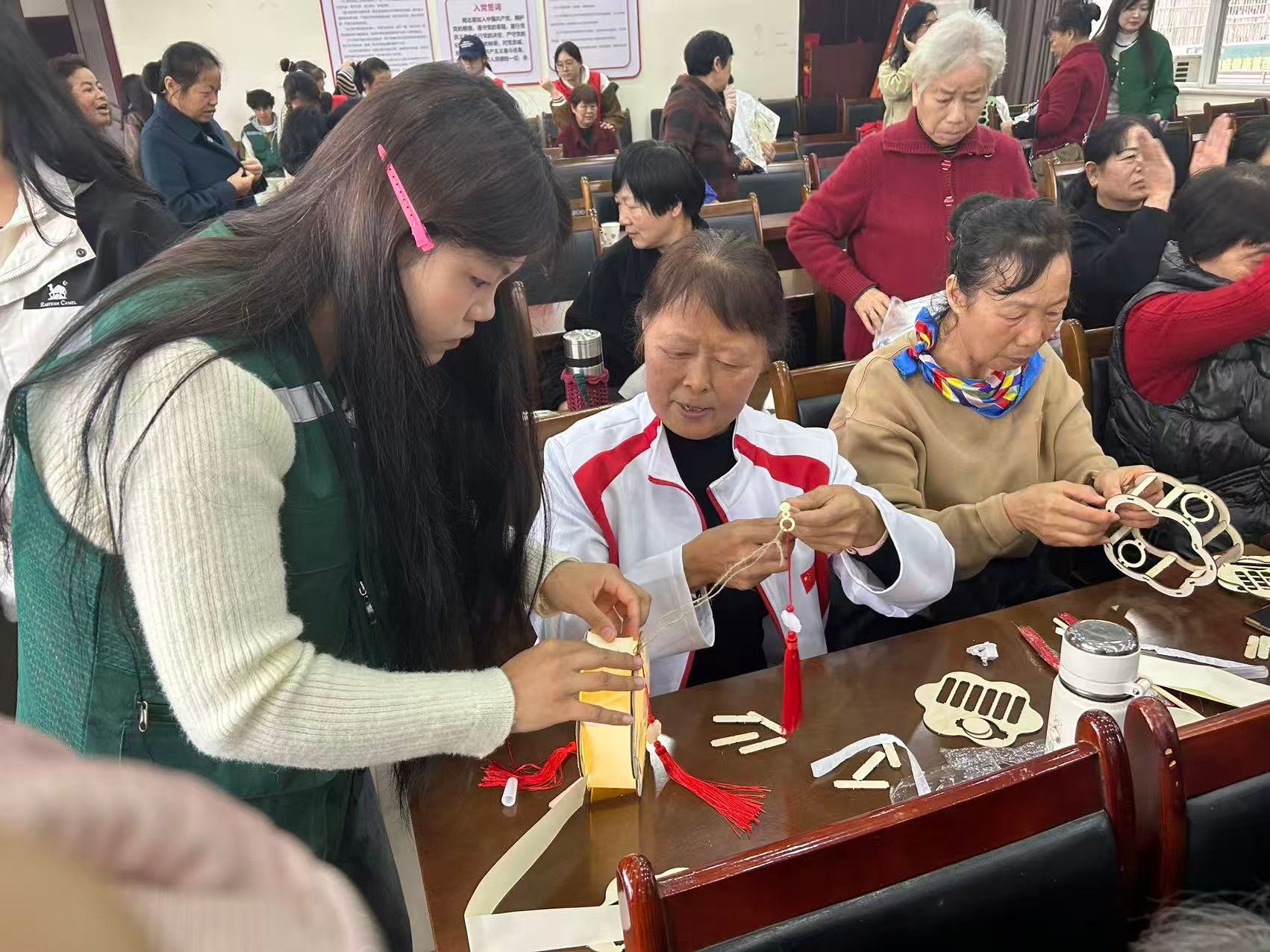 活动现场秩序井然,志愿者们有序引导老年人签到入场,两大核心环节接连展开。“巧手传民俗,重阳共安康”手工互动中,志愿者向老人们送上节日祝福,手把手演示灯笼DIY技巧,从骨架搭建到纹样粘贴耐心指导,不少老人完成作品后主动展示,志愿者及时用相机记录下这些笑脸,后续将冲印赠予留作纪念,让老人们在动手实践中感受重阳文化的独特魅力。“安全伴我行,守护夕阳红”知识科普环节,志愿者结合老年人生活场景,用通俗语言讲解居家用电安全、电信诈骗识别、突发疾病应急处理等内容,还针对重阳登高习俗补充户外防滑、秋季养生知识,通过趣味问答和小礼品调动参与热情,帮助老人更好地掌握安全常识