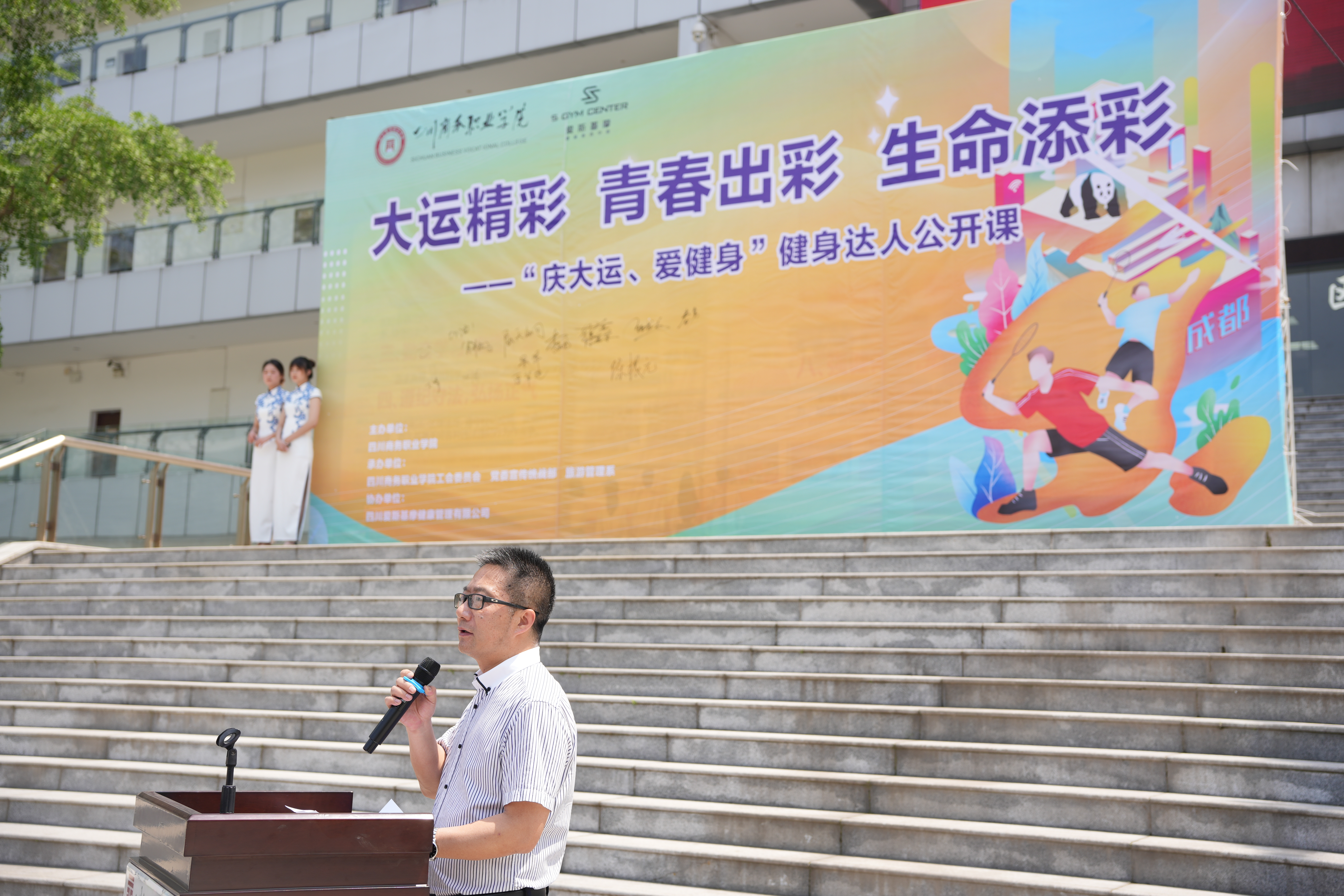 下午14时,另一场别有特色的健身达人公开课也紧锣密鼓开课。休闲体育专业2017级毕业、四川省健身健美锦标赛冠军获得者、西南五省健身健美大赛冠军及法拉利中华区健身健美第一名获得者蒋鑫回到熟悉的校园,带领热爱运动,欢庆大运的师生们,以“大运精彩,青春出彩,生命添彩”的口号开展了健身健美公开课。开课现场,学院党委副书记张军致辞:体育运动不仅仅是社会发展和人类文明进步的重要标志,还是增强体魄、锻炼意志、释放压力、交流情感的重要载体,希望休闲体育专业以此次公开课为契机,提高师生专业技能水平,不断提高人才培养质量,最终形成品牌和特色,立足成都,面向全省展示商院休闲体育专业师生风采。