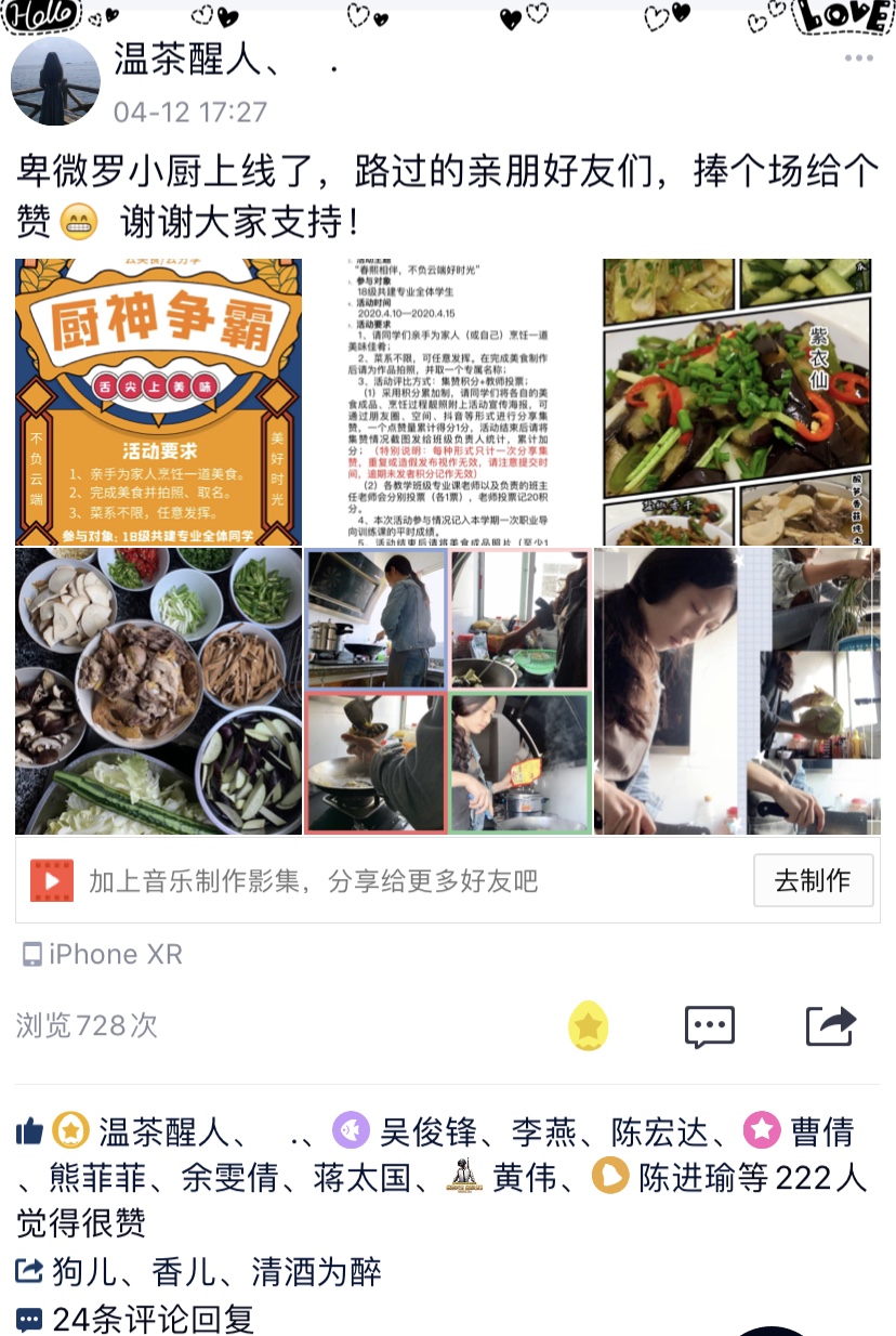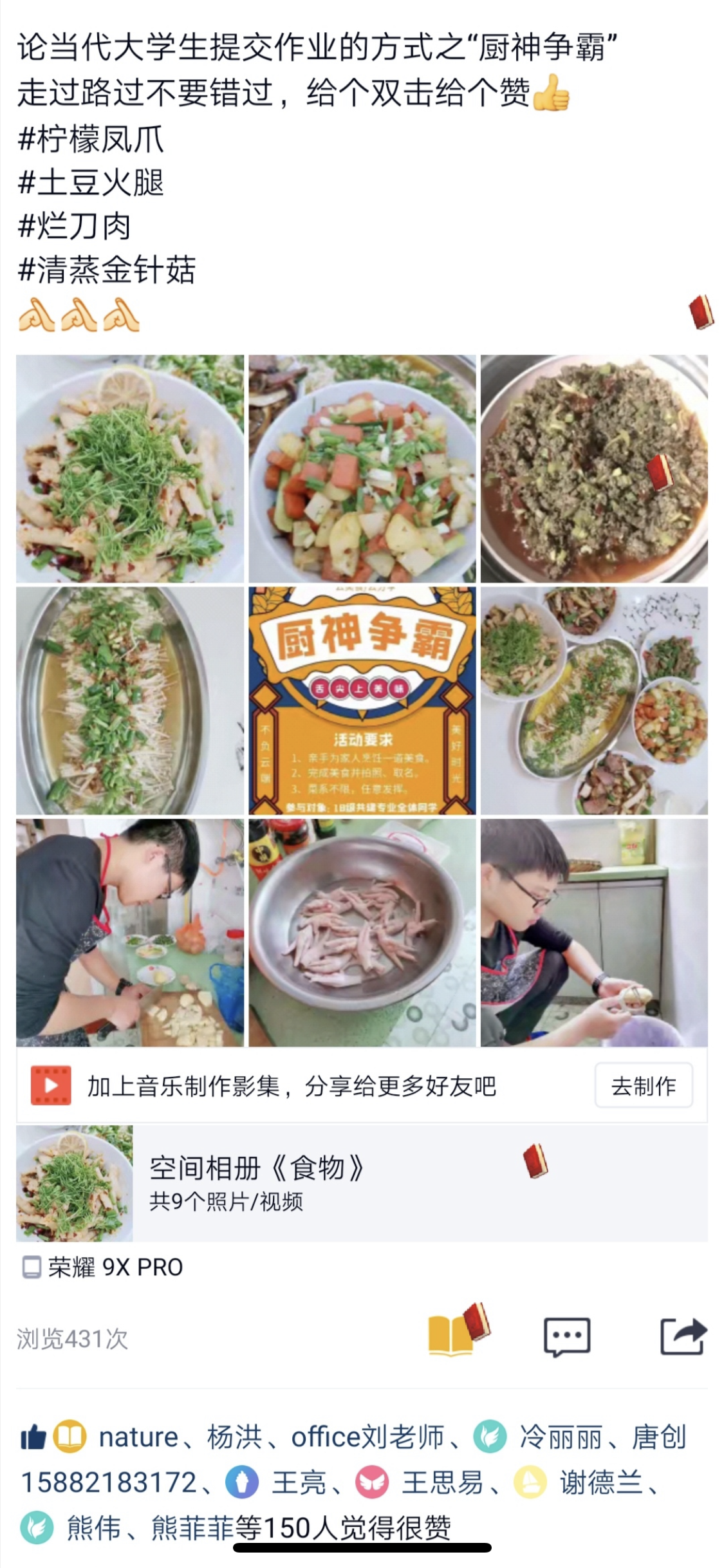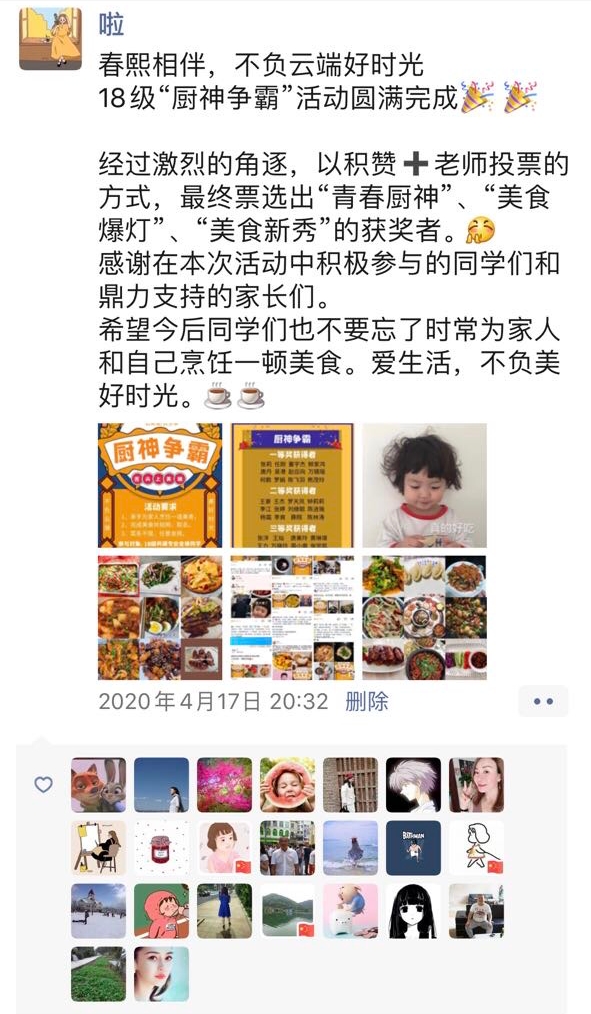 此次线上“厨神争霸”大赛不仅是线上教学模式的一次创新,也是疫情期间一次特别的心理疏导尝试,获得了学校老师、学生及家长的一致好评。同时,也让每一个学生在隔空管理的状态下,通过多方合力,汲取生活正能量,提高学习自律性。