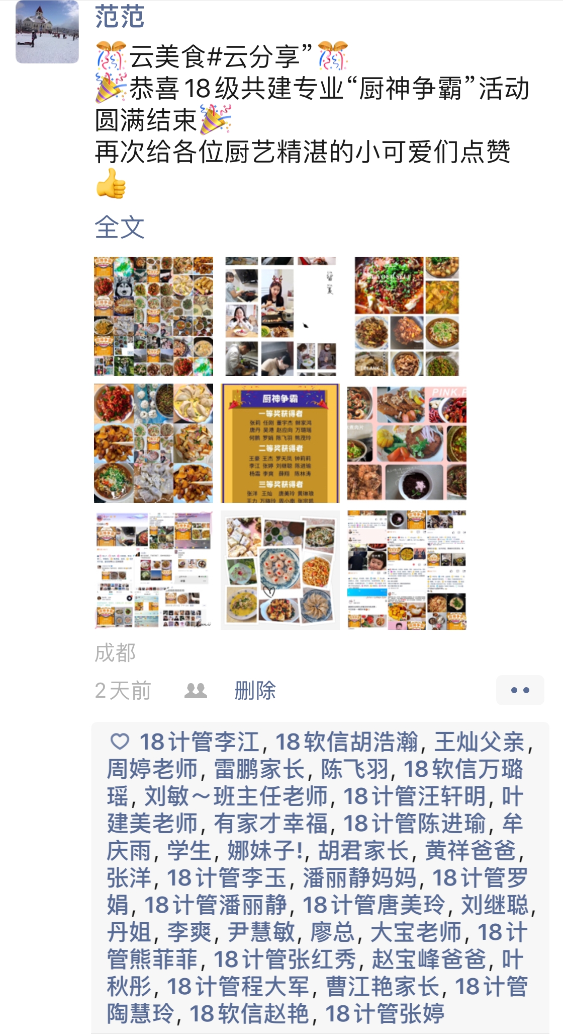 本次线上“厨神争霸”大赛以教学班级为单位,各班级奖项设置分别设有青春厨神奖(第一名)、美食爆灯奖(第二名)、美食新秀奖(第三名)。为确保本次大赛的公平公正,活动评选采用集赞积分+教师投票的方式,要求参赛选手将各自的美食成品、烹饪过程靓照附上活动宣传海报,通过朋友圈、QQ空间、抖音等社交平台进行分享集赞,累计积分,最后再由各教学班级班主任及科任老师参照菜系成品进行集中投票。经过一周激烈的角逐,根据各社交平台积分累积与评委的慎重投票,来自12个班级的优秀“厨神”诞生!