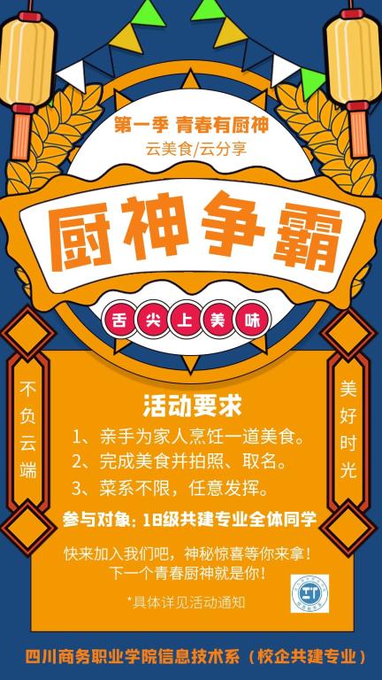 在疫情防控的特殊时期,为响应国家号召,我校“停课不停教、停课不停学”线上教学工作已持续开展一个半月,同学们已逐渐适应网课学习新常态,基本做到“线上线下不懈怠,在校居家无差别”。为进一步丰富同学们的课余生活,帮助大家树立课堂学习自信,为“宅家”成长添加养料,伟德国际victor1946信息技术系校企共建专业于4月10日-4月17日,面向18级全体共建学子开展了“春熙相伴,不负云端好时光”系列主题活动之线上“厨神争霸”大赛。