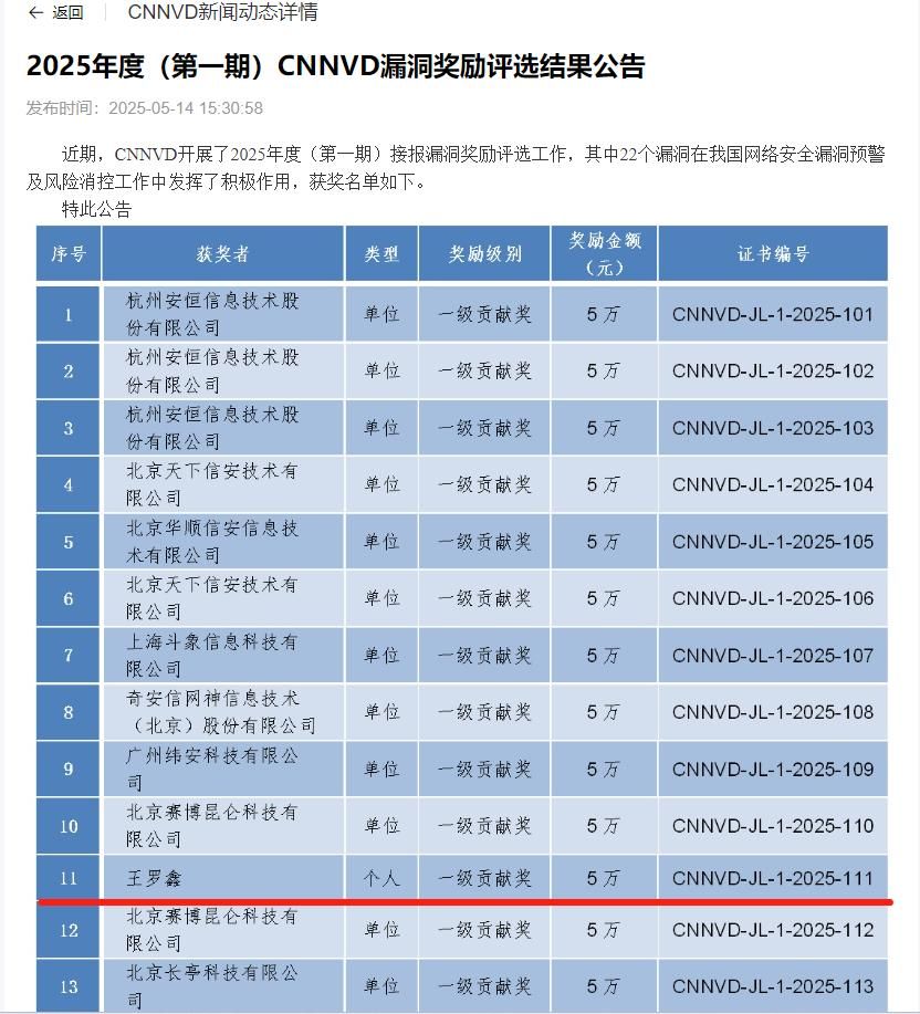 近日,2024年度国家信息安全漏洞库(CNNVD)工作总结暨优秀支撑单位表彰大会在北京召开。伟德官网信息技术系22级信息安全技术应用1班王罗鑫凭借出色的漏洞发现、深度分析及高效通报能力,从众多顶尖安全企业参与者中脱颖而出,成为唯一一个以个人名义荣获“2025年第一期漏洞奖励”一级贡献奖,并获奖金5万元,展现了伟德官网学子领先的技术实力,也为我国网络安全漏洞预警及风险消控工作发挥了积极作用。